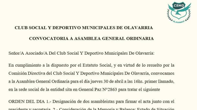 Asamblea Ordinaria del Club Social y Deportivo Municipales de Olavarría